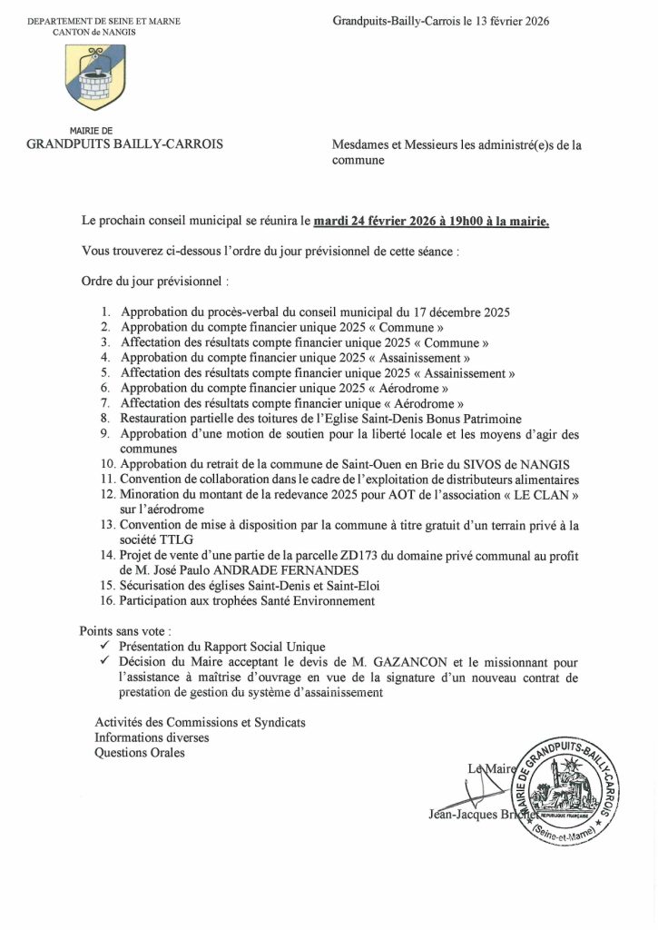 La prochaine séance du Conseil Municipal se déroulera le mardi 24 février 2026 à 19h00 en mairie