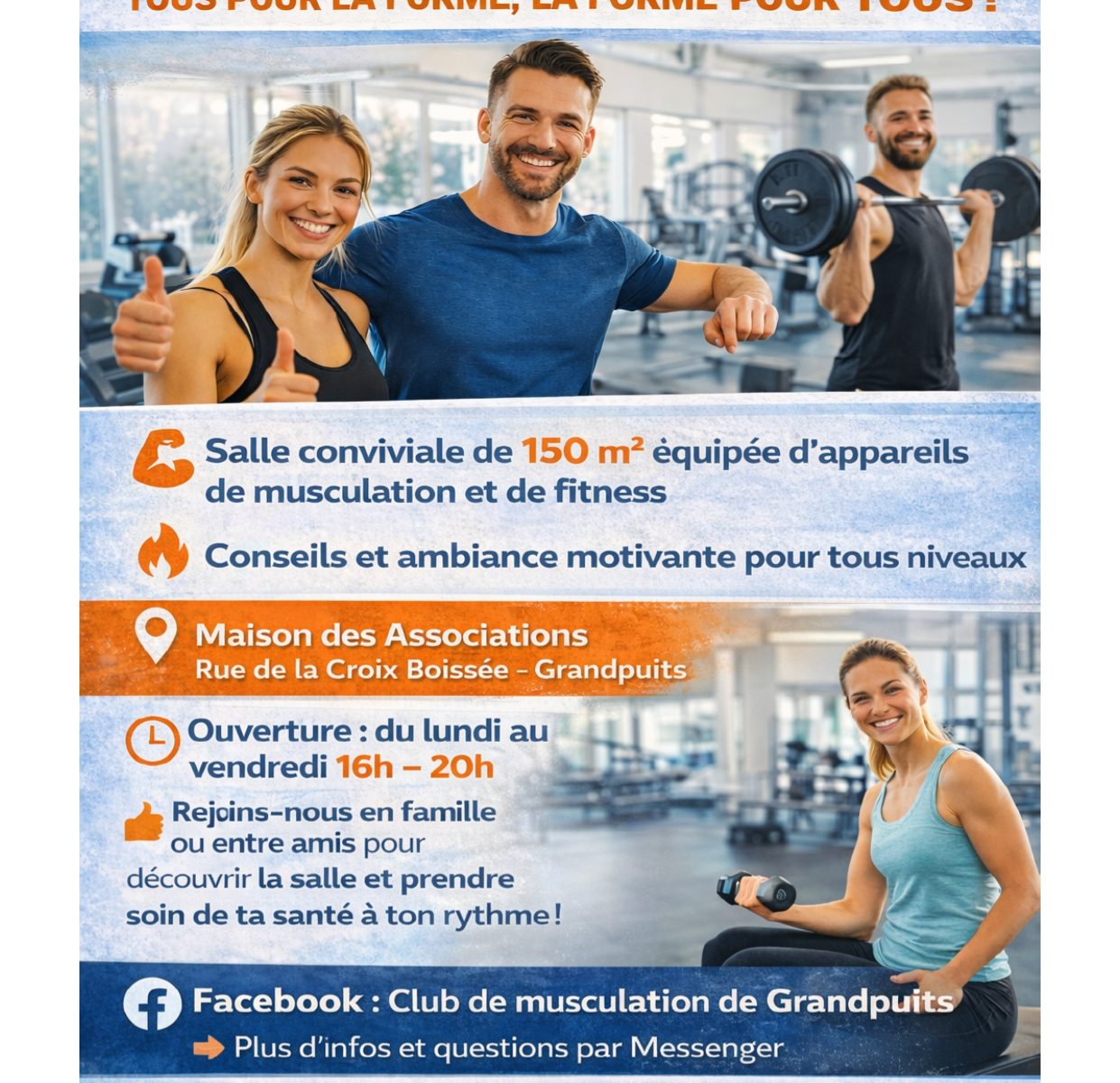 Martine vous accueille dans la salle polyvalente de Grandpuits pour 1h30 de cours: